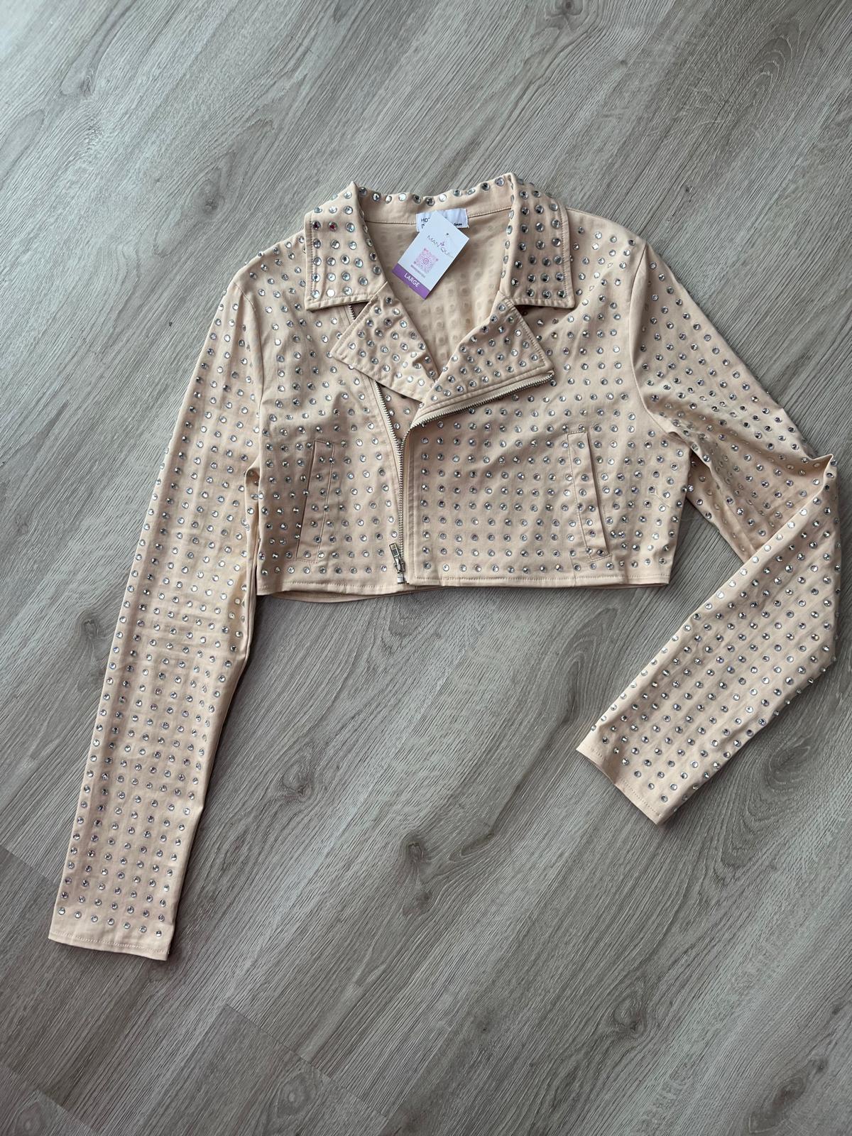 Este elegante chaqueta moto es brillante con piedras preciosas. Con un diseño atrevido pero elegante, esta chaqueta seguramente se destacará en cualquier ocasión. Con su ajuste cómodo y suave, esta chaqueta es perfecta para mantenerte abrigado y con estilo durante todo el año.