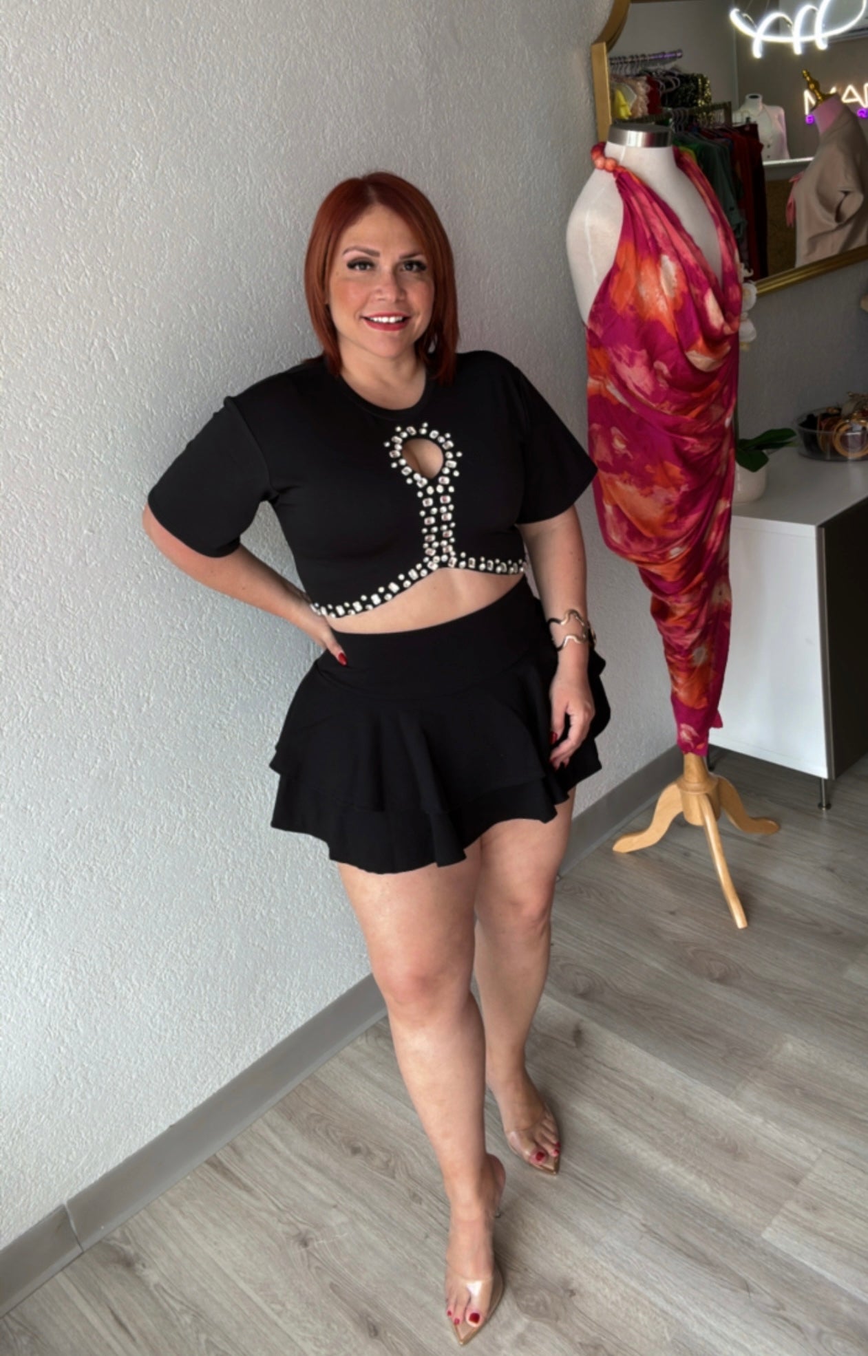 Este skort mini con capas de volantes es perfecto para añadir un toque femenino a cualquier atuendo. Su diseño único te hará destacar en cualquier ocasión, mientras que su cómoda silueta te permitirá moverte con facilidad. Una opción elegante y versátil para tu guardarropa.