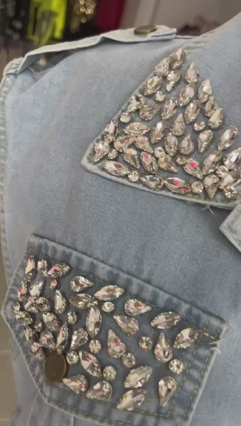 Este mono de mezclilla y brillantes es la prenda perfecta para destacar en cualquier ocasión. Con un diseño elegante y moderno, estarás a la moda y cómodo al mismo tiempo. Los detalles de brillantes agregan un toque de glamour a este clásico estilo de mezclilla. ¡Siéntete seguro y con estilo con este mono único!